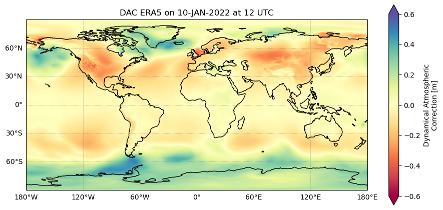 Atmospheric CorrectionDynamic Atmospheric Correction using ERA5 Correction of the ocean response to atmospheric wind and pressure forcing, DAC-ERA5 product is a combination between TUGO HR barotropic model output (high frequencies) and the Inverted Barometer correction (IB, low frequencies). |  |