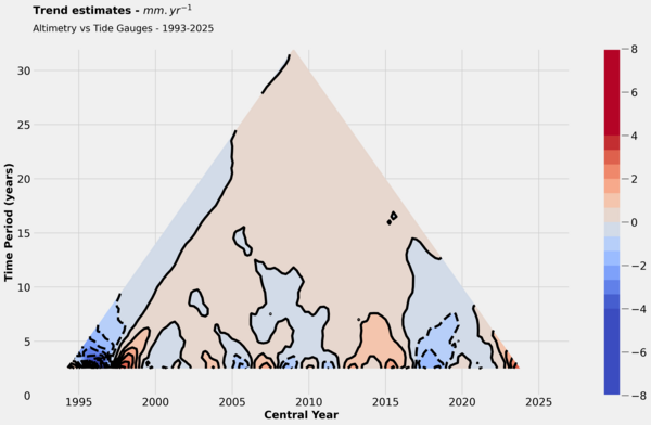 Finally, this last figure illustrates the relative drift between altimetry and tide gauges data across various time periods of different lengths. The x-axis represents the central date of each studied period, while the y-axis indicates the duration of the period.