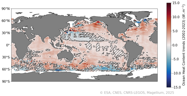 The “altimetry-gravimetry” method allows retrieving the OHC change (also called the ocean heat uptake) from April 2002 onwards (corresponding to first GRACE gravimetry data). Map of the regional OHC trends over April 2002 to September 2023 are displayed here (product version 3.0). Hatched areas are regions where regional OHC trends are not significant at the 68% confidence level (CL).